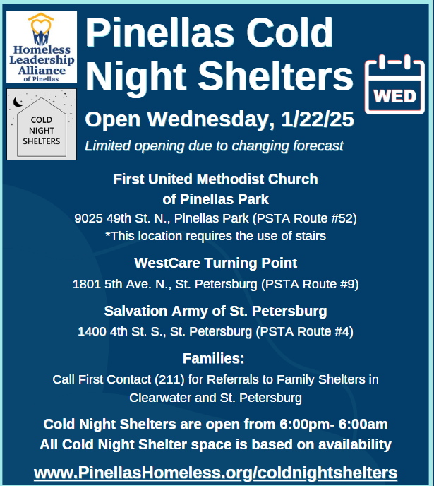 Pinellas County's Cold Night Shelters have been activated for Wednesday, January 22.