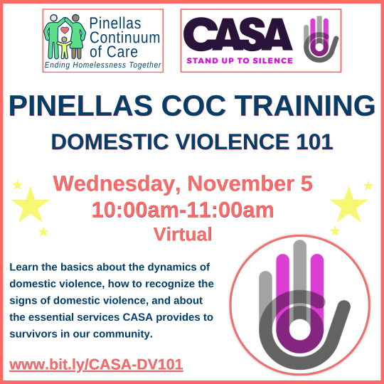 Pinellas Continuum of Care (CoC) providers, members, and volunteers participated in Domestic Violence 101, hosted by CASA. During this training, participants will learn the basics about the dynamics of domestic violence, how to recognize the signs of domestic violence, and about the essential services CASA provides to survivors in our community.