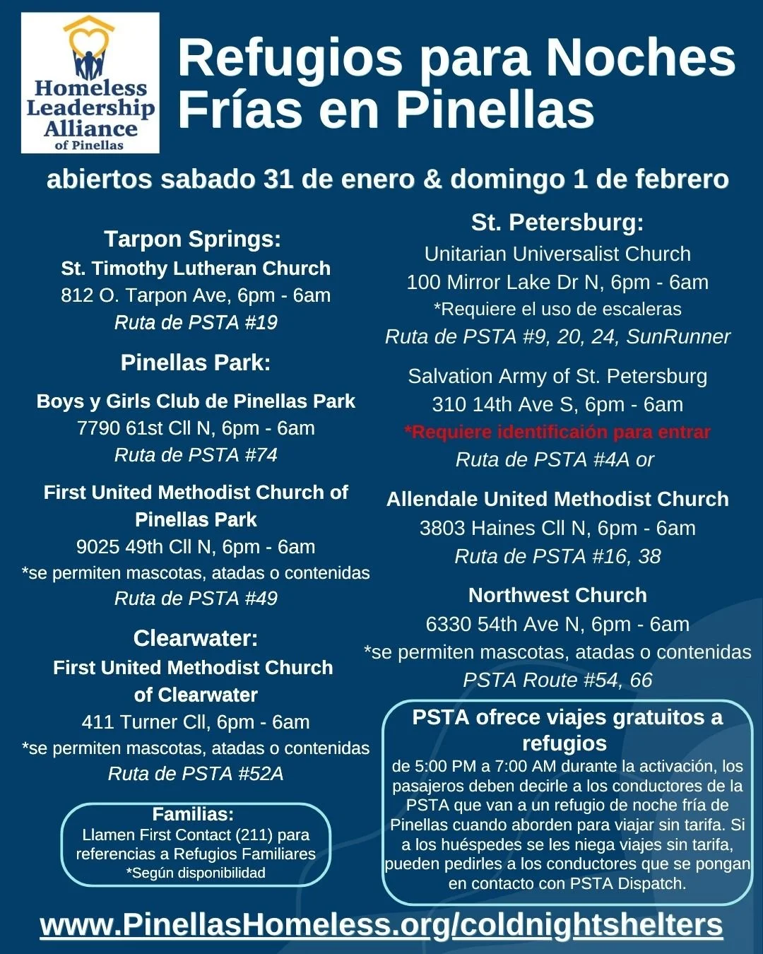 Through a partnership with the Pinellas Suncoast Transit Authority (PSTA), bus rides to and from Cold Night Shelters will be free from 5:00pm to 7:00am during the activation. Riders must tell PSTA drivers that they are going to a Pinellas Cold Night Shelter when boarding to ride fare-free. If clients are being denied fare-free rides, they can ask the drivers to contact PSTA dispatch.