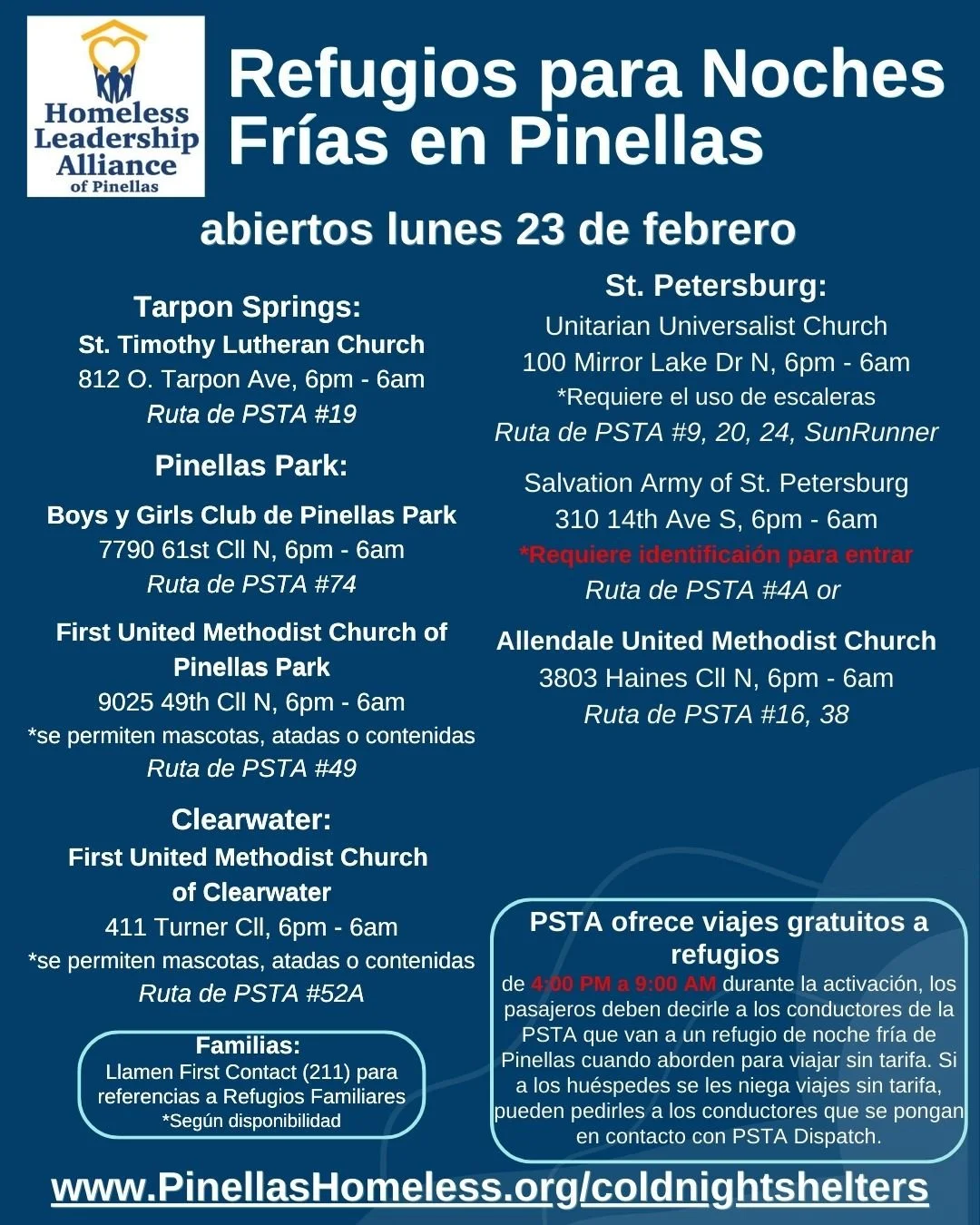 Through a partnership with the Pinellas Suncoast Transit Authority (PSTA), bus rides to and from Cold Night Shelters will be free from 5:00pm to 7:00am during the activation. Riders must tell PSTA drivers that they are going to a Pinellas Cold Night Shelter when boarding to ride fare-free. If clients are being denied fare-free rides, they can ask the drivers to contact PSTA dispatch.
